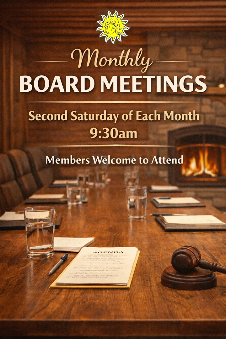 Board Meeting Scheduled for 2nd Saturday of every month at 9:30am.
