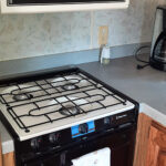 Stove, refrigerator, and dishwashing area located inside the clubhouse.